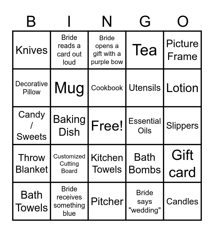 This bingo card has a free space and 39 words: Bible, Devotional Book, Prayer Journal, Mug, Bath Towels, Kitchen Towels, Cookbook, Kitchen Utensils, Picture Frame, Throw Blanket, Baking Dish, Tea, Candles, Slippers, Essential Oils, Customized Cutting Board, Coasters, Knives, Apron, Bath Bombs, Decorative Pillow, Pitcher, Utensils, Lotion, Bride talks about groom, Bride opens a gift bag, Bride wears a bow, Bride laughs, Bride describes a gift as "cute", Bride reads a card out loud, Bride receives cookware, Bride opens a gift wrapped in pink, Bride opens a gift with a purple bow, Bride receives something blue, Bride says "wedding", Sheet sets, Gift card, Candy / Sweets and Soap.