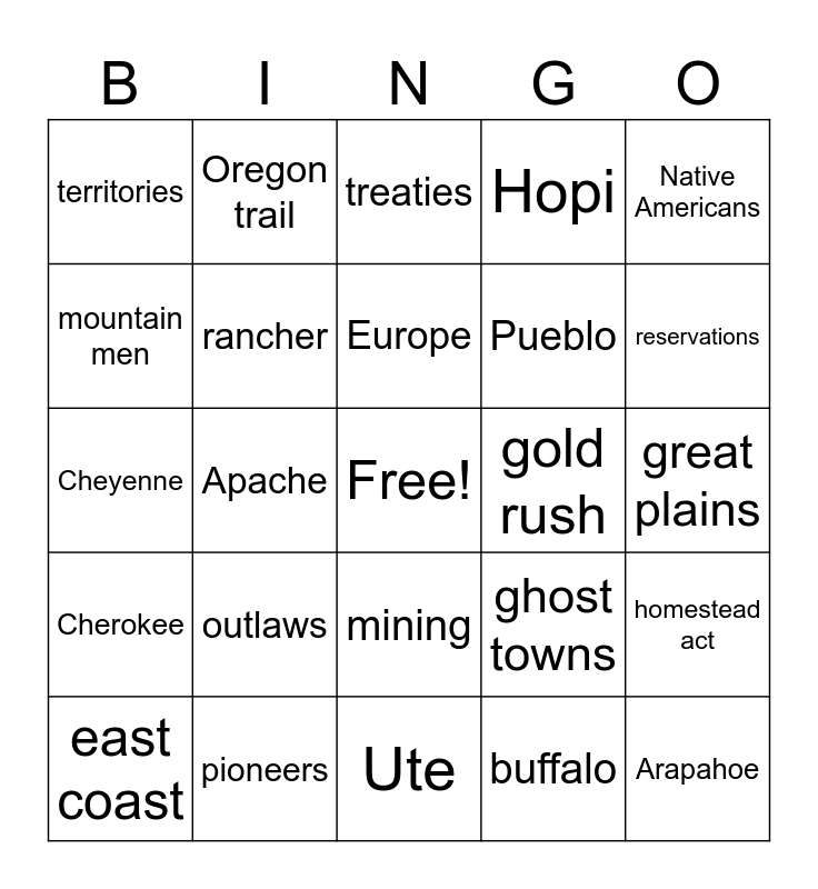 This bingo card has a free space and 24 words: outlaws, pioneers, Europe, east coast, Native Americans, territories, mountain men, Oregon trail, gold rush, mining, Pueblo, Cheyenne, ghost towns, homestead act, rancher, buffalo, great plains, treaties, reservations, Apache, Arapahoe, Cherokee, Hopi and Ute.