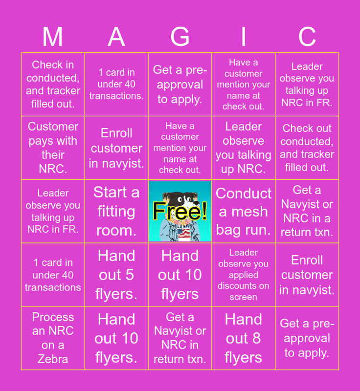 This bingo card has a free space and 25 words: Hand out 5 flyers., Get a Navyist or NRC in return txn., Have a customer mention your name at check out., Process an NRC on a Zebra, Leader observe you talking up NRC in FR., Check in conducted, and tracker filled out., Customer pays with their NRC., 1 card in under 40 transactions., Conduct a mesh bag run., Hand out 10 flyers, Leader observe you talking up NRC., Leader observe you talking up NRC in FR., Leader observe you applied discounts on screen, Enroll customer in navyist., Enroll customer in navyist., Process an NRC on a Zebra, Get a Navyist or NRC in a return txn., Get a pre-approval to apply., Check out conducted, and tracker filled out., Start a fitting room., Get a pre-approval to apply., Hand out 10 flyers., 1 card in under 40 transactions, Have a customer mention your name at check out. and Hand out 8 flyers.