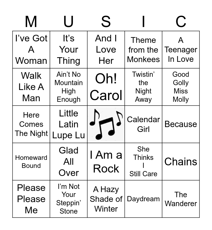 This bingo card has a free space and 60 words: I’m Down, I’m Not Your Steppin’ Stone, Boys, Homeward Bound, Daydream, Let’s Get it On, Ain’t No Mountain High Enough, You Send Me, Twistin’ the Night Away, Come On Let’s Go, Theme from the Monkees, Pleasant Valley Sunday, Walk Like A Man, Wouldn’t it Be Nice, I Can’t Stop Loving You, I’ve Got A Woman, The Wanderer, A Teenager In Love, Abraham, Maritn & John, Oh! Carol, Calendar Girl, And I Love Her, Please Please Me, Chains, Money Honey, Heartbreak Hotel, Hound Dog, Wild One, Good Golly Miss Molly, Rip It Up, The Twist, Limbo Rock, The Stroll, This Old Heart Of Mine, It’s Your Thing, Dream Lover, Teenager In Love, Little Latin Lupe Lu, Baby Please Don’t Go, Here Comes The Night, All I Really Want To Do, Glad All Over, Because, Can’t you See That She’s Mine, She Thinks I Still Care, I Fall To Pieces, Funny How Time Slips Away, Cryin’ Time, Make the World Go Away, I Am a Rock, A Hazy Shade of Winter, Draggin’ The Line, Mirage, Baby Love, You Keep Me Hangin’ On, I Can’t Help Myself, You Can’t Hurry Love, Little Deuce Coupe, Dance Dance Dance and Help Me Rhonda.