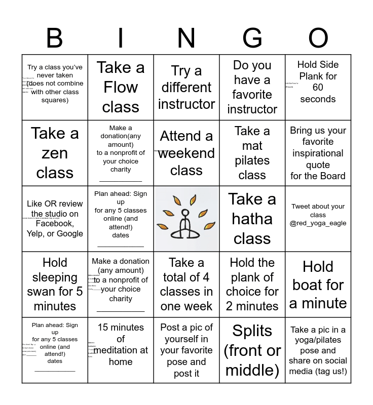 This bingo card has 7 images, a free space and 24 words: Make a donation (any amount) to a nonprofit of your choice charity ___________, 15 minutes of meditation at home, Attend a weekend class, Plan ahead: Sign up for any 5 classes online (and attend!) dates ____________, Hold Side Plank for 60 seconds, Try a class you’ve never taken (does not combine with other class squares), Take a zen class, Take a Flow class, Take a hatha class, Take a total of 4 classes in one week, Take a mat pilates class, Like OR review the studio on Facebook, Yelp, or Google, Hold the plank of choice for 2 minutes, Hold boat for a minute, Make a donation(any amount) to a nonprofit of your choice charity ___________, Splits (front or middle), Tweet about your class @red_yoga_eagle, Try a different instructor, Bring us your favorite inspirational quote for the Board, Plan ahead: Sign up for any 5 classes online (and attend!) dates ____________, Take a pic in a yoga/pilates pose and share on social media (tag us!), Hold sleeping swan for 5 minutes, Do you have a favorite instructor and Post a pic of yourself in your favorite pose and post it.