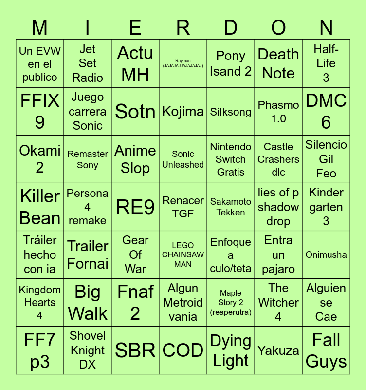This bingo card has a free space and 48 words: Tráiler hecho con ia, Persona 4 remake, SBR, LEGO CHAINSAW MAN, Silksong, lies of p shadow drop, Half-Life 3, FF7 p3, Remaster Sony, RE9, Rayman (JAJAJAJJAJAJAJAJ), Pony Isand 2, Castle Crashers dlc, Silencio Gil Feo, Killer Bean, Big Walk, Actu MH, Sonic Unleashed, Maple Story 2 (reaperutra), Death Note, DMC 6, FFIX 9, Jet Set Radio, Sotn, Dying Light, Phasmo 1.0, Kinder garten 3, Kingdom Hearts 4, Trailer Fornai, Anime Slop, Algun Metroid vania, Nintendo Switch Gratis, The Witcher 4, Alguien se Cae, Un EVW en el publico, Shovel Knight DX, Gear Of War, COD, Sakamoto Tekken, Yakuza, Onimusha, Okami 2, Juego carrera Sonic, Fnaf 2, Kojima, Enfoque a culo/teta, Entra un pajaro and Fall Guys.