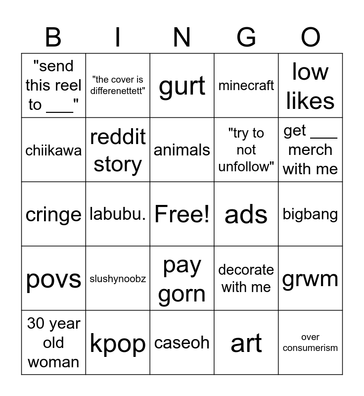 This bingo card has a free space and 24 words: slushynoobz, kpop, animals, 30 year old woman, low likes, "send this reel to ___", chiikawa, "the cover is differenettett", ads, pay gorn, "try to not unfollow", cringe, decorate with me, grwm, reddit story, art, bigbang, gurt, get ___ merch with me, labubu., over consumerism, povs, minecraft and caseoh.