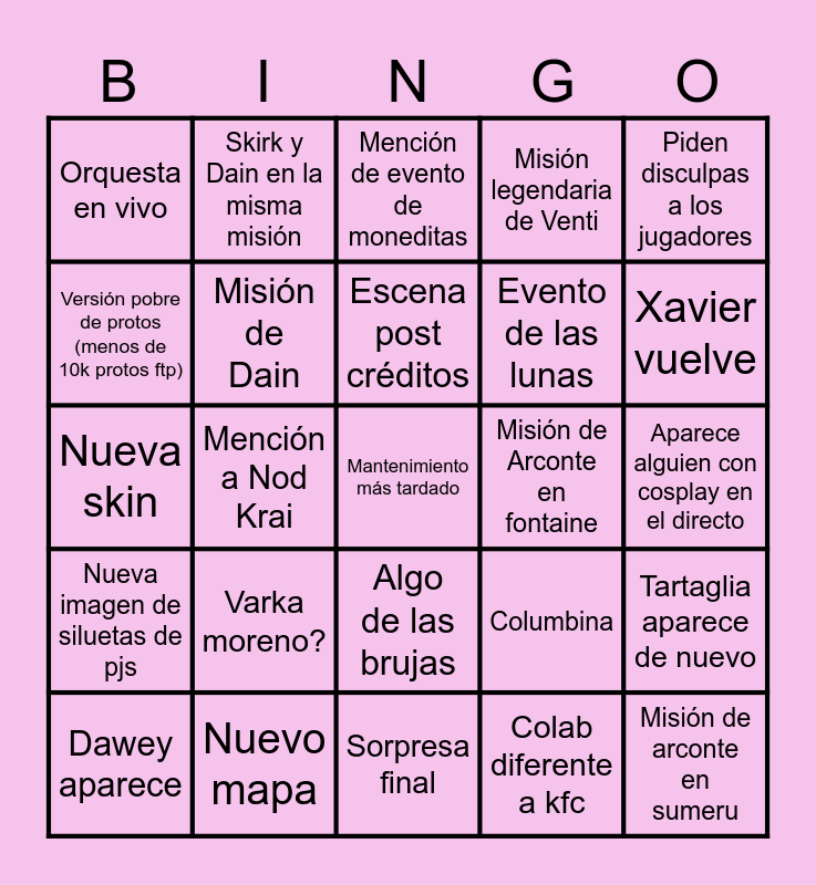This bingo card has a free space and 24 words: Varka moreno?, Nuevo mapa, Escena post créditos, Dawey aparece, Piden disculpas a los jugadores, Orquesta en vivo, Versión pobre de protos (menos de 10k protos ftp), Skirk y Dain en la misma misión, Misión de Arconte en fontaine, Algo de las brujas, Evento de las lunas, Nueva skin, Columbina, Tartaglia aparece de nuevo, Misión de Dain, Colab diferente a kfc, Aparece alguien con cosplay en el directo, Mención de evento de moneditas, Xavier vuelve, Mención a Nod Krai, Misión de arconte en sumeru, Nueva imagen de siluetas de pjs, Misión legendaria de Venti and Sorpresa final.