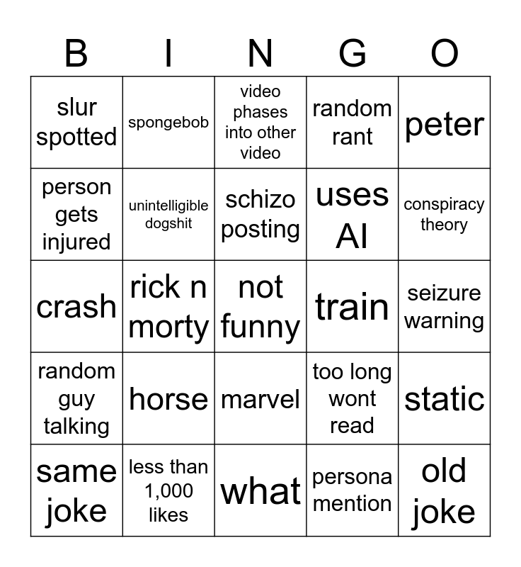 This bingo card has a free space and 24 words: horse, less than 1,000 likes, schizo posting, same joke, peter, slur spotted, person gets injured, spongebob, train, marvel, uses AI, crash, too long wont read, static, unintelligible dogshit, persona mention, seizure warning, video phases into other video, conspiracy theory, rick n morty, old joke, random guy talking, random rant and what.