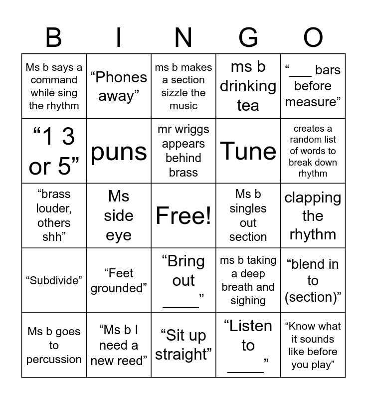 This bingo card has a free space and 25 words: “Feet grounded”, “Sit up straight”, mr wriggs appears behind brass, Ms b goes to percussion, “___ bars before measure”, Ms b says a command while sing the rhythm, “1 3 or 5”, “Phones away”, Ms b singles out section, “Bring out ____”, Tune, “brass louder, others shh”, ms b taking a deep breath and sighing, “blend in to (section)”, puns, “you’re slowing down” in thinking scale, clapping the rhythm, ms b makes a section sizzle the music, creates a random list of words to break down rhythm, Ms side eye, “Know what it sounds like before you play”, “Ms b I need a new reed”, “Subdivide”, ms b drinking tea and “Listen to ____”.