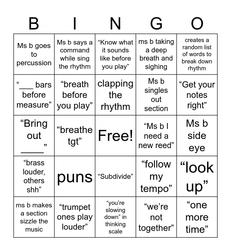 This bingo card has a free space and 25 words: puns, “you’re slowing down” in thinking scale, clapping the rhythm, ms b makes a section sizzle the music, creates a random list of words to break down rhythm, Ms b goes to percussion, “___ bars before measure”, Ms b says a command while sing the rhythm, “Ms b I need a new reed”, “Subdivide”, Ms b singles out section, “Bring out ____”, “follow my tempo”, “look up”, “breath before you play”, “Phones away”, Ms b side eye, “Know what it sounds like before you play”, “Get your notes right”, “breathe tgt”, “one more time”, “trumpet ones play louder”, “brass louder, others shh”, ms b taking a deep breath and sighing and “we’re not together”.