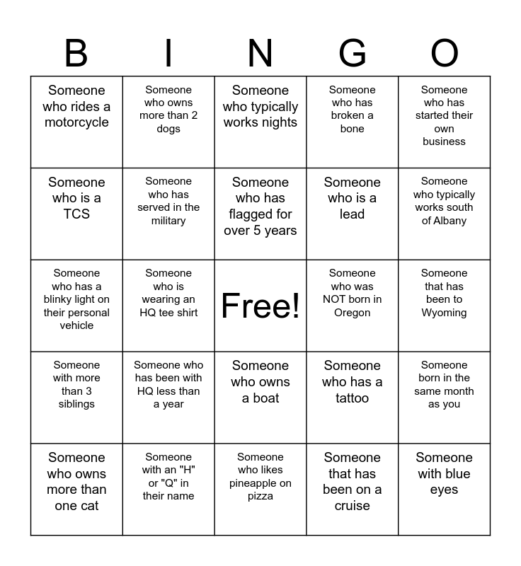 This bingo card has a free space and 24 words: Someone who has been with HQ less than a year, Someone with an "H" or "Q" in their name, Someone who has flagged for over 5 years, Someone who owns more than one cat, Someone who has started their own business, Someone who rides a motorcycle, Someone who is a TCS, Someone who owns more than 2 dogs, Someone who was NOT born in Oregon, Someone who owns a boat, Someone who is a lead, Someone who has a blinky light on their personal vehicle, Someone who has a tattoo, Someone born in the same month as you, Someone who has served in the military, Someone that has been on a cruise, Someone that has been to Wyoming, Someone who typically works nights, Someone who typically works south of Albany, Someone who is wearing an HQ tee shirt, Someone with blue eyes, Someone with more than 3 siblings, Someone who has broken a bone and Someone who likes pineapple on pizza.