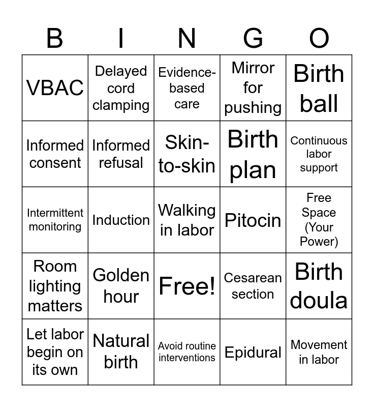 This bingo card has 26 words: Free!, Epidural, Skin-to-skin, Natural birth, Birth ball, VBAC, Informed consent, Delayed cord clamping, Free Space (Your Power), Cesarean section, Birth plan, Intermittent monitoring, Birth doula, Let labor begin on its own, Induction, Upright positions, Mirror for pushing, Room lighting matters, Evidence-based care, Walking in labor, Continuous labor support, Avoid routine interventions, Pitocin, Golden hour, Informed refusal and Movement in labor.