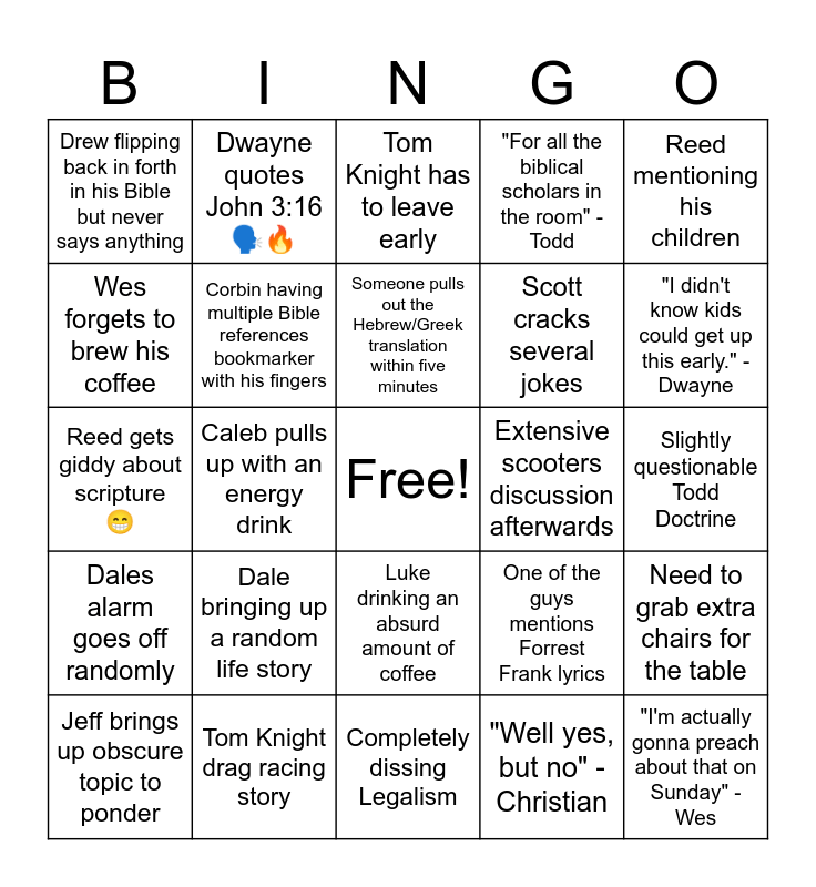 This bingo card has a free space and 24 words: Dale bringing up a random life story, Tom Knight drag racing story, Someone pulls out the Hebrew/Greek translation within five minutes, Jeff brings up obscure topic to ponder, Reed mentioning his children, Drew flipping back in forth in his Bible but never says anything, Wes forgets to brew his coffee, Dwayne quotes John 3:16 🗣️🔥, Extensive scooters discussion afterwards, Luke drinking an absurd amount of coffee, Scott cracks several jokes, Reed gets giddy about scripture 😁, One of the guys mentions Forrest Frank lyrics, Need to grab extra chairs for the table, Corbin having multiple Bible references bookmarker with his fingers, "Well yes, but no" -Christian, Slightly questionable Todd Doctrine, Tom Knight has to leave early, "I didn't know kids could get up this early." -Dwayne, Caleb pulls up with an energy drink, "I'm actually gonna preach about that on Sunday" -Wes, Dales alarm goes off randomly, "For all the biblical scholars in the room" -Todd and Completely dissing Legalism.