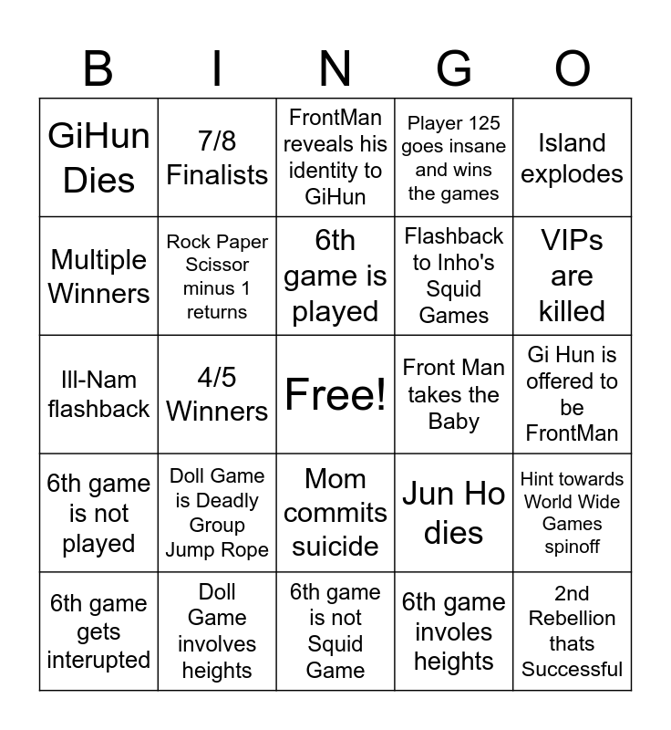 This bingo card has a free space and 24 words: Doll Game is Deadly Group Jump Rope, Doll Game involves heights, 6th game is played, 6th game gets interupted, Island explodes, GiHun Dies, Multiple Winners, 7/8 Finalists, Front Man takes the Baby, Mom commits suicide, Flashback to Inho's Squid Games, Ill-Nam flashback, Jun Ho dies, Hint towards World Wide Games spinoff, Rock Paper Scissor minus 1 returns, 6th game involes heights, Gi Hun is offered to be FrontMan, FrontMan reveals his identity to GiHun, VIPs are killed, 4/5 Winners, 2nd Rebellion thats Successful, 6th game is not played, Player 125 goes insane and wins the games and 6th game is not Squid Game.