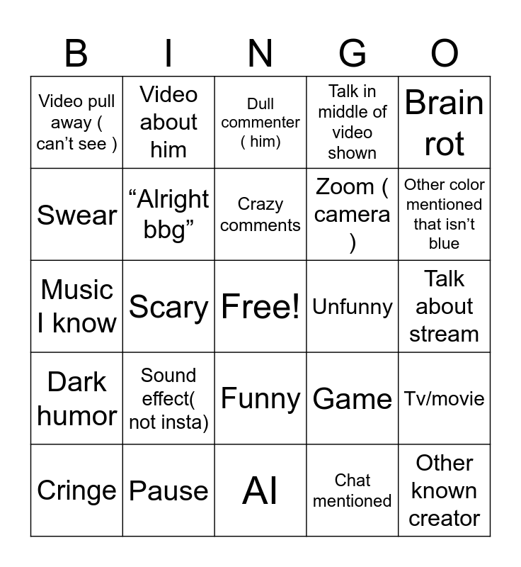 This bingo card has a free space and 24 words: Sound effect( not insta), Pause, Crazy comments, Cringe, Brain rot, Video pull away ( can’t see ), Swear, Video about him, Unfunny, Funny, Zoom ( camera ), Music I know, Game, Tv/movie, “Alright bbg”, Chat mentioned, Talk about stream, Dull commenter ( him), Other color mentioned that isn’t blue, Scary, Other known creator, Dark humor, Talk in middle of video shown and AI.