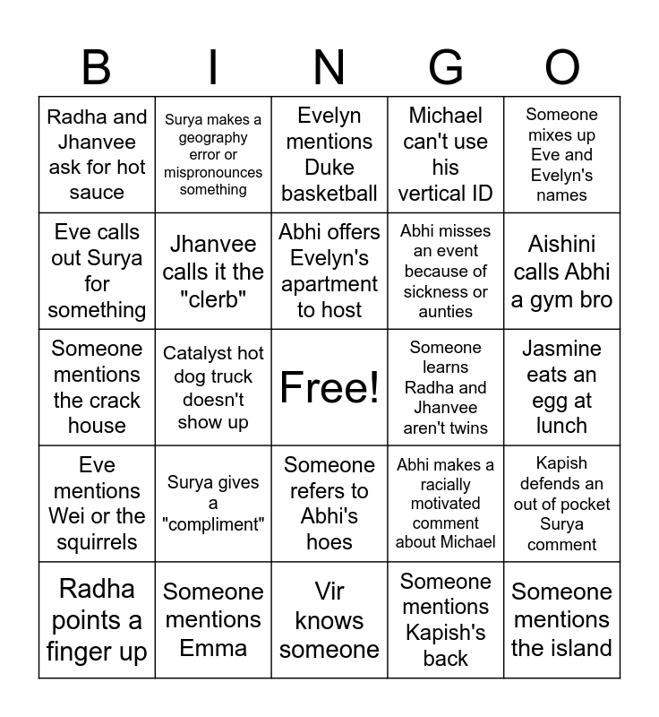 This bingo card has a free space and 24 words: Surya gives a "compliment", Someone mentions Emma, Abhi offers Evelyn's apartment to host, Radha points a finger up, Someone mixes up Eve and Evelyn's names, Radha and Jhanvee ask for hot sauce, Eve calls out Surya for something, Surya makes a geography error or mispronounces something, Someone learns Radha and Jhanvee aren't twins, Someone refers to Abhi's hoes, Abhi misses an event because of sickness or aunties, Someone mentions the crack house, Abhi makes a racially motivated comment about Michael, Kapish defends an out of pocket Surya comment, Jhanvee calls it the "clerb", Someone mentions Kapish's back, Jasmine eats an egg at lunch, Evelyn mentions Duke basketball, Aishini calls Abhi a gym bro, Catalyst hot dog truck doesn't show up, Someone mentions the island, Eve mentions Wei or the squirrels, Michael can't use his vertical ID and Vir knows someone.