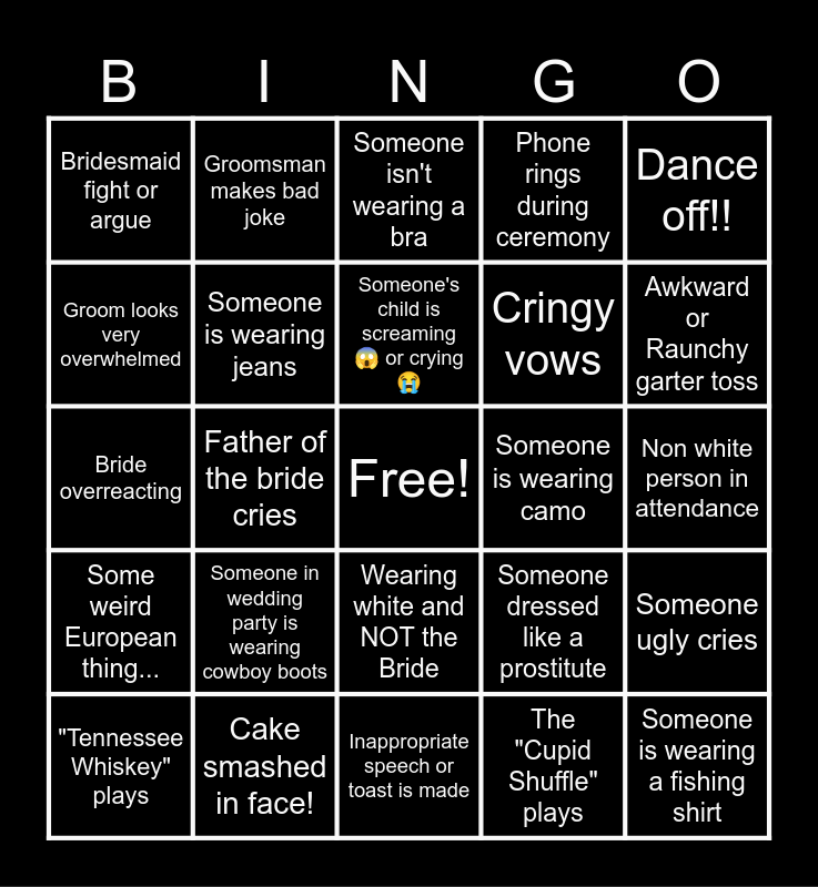 This bingo card has a free space and 29 words: "Tennessee Whiskey" plays, Mother of the bride spills her drink, Father of the bride cries, Best man or groomsman gets drunk, Bridesmaid fight or argue, Someone isn't wearing a bra, Someone is wearing jeans, Someone in wedding party is wearing cowboy boots, Someone is wearing camo, Cake smashed in face!, Non white person in attendance, Someone is wearing a fishing shirt, Inappropriate speech or toast is made, The "Cupid Shuffle" plays, Awkward or Raunchy garter toss, Wardrobe malfunction, Wearing white and NOT the Bride, Some weird European thing..., Dance off!!, Bride overreacting, Someone dressed like a prostitute, Someone with way too much perfume or cologne on, Cringy vows, Groom looks very overwhelmed, Phone rings during ceremony, Groomsman makes bad joke, Someone ugly cries, Someone's child is screaming 😱 or crying 😭 and Group of people doing shots together.