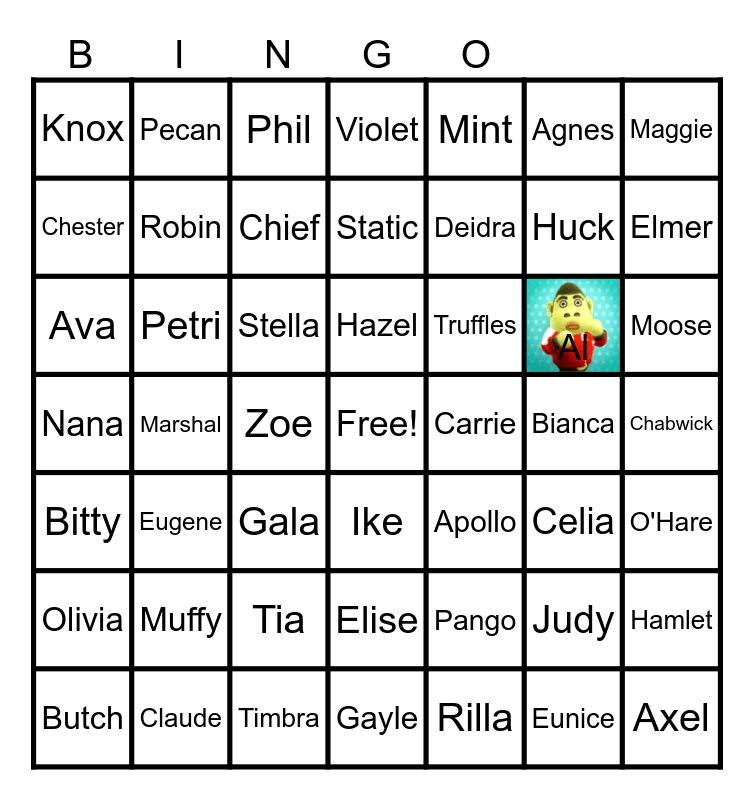 This bingo card has 24 images, a free space and 436 words: Baabara, Hooper, Pietro, Raymond, Naomi, Candi, Elise, Tad, Bea, Flo, Bitty, Elvis, Judy, Ketchup, Peggy, Al, Chops, Axel, Octavian, Friga, Kyle, Norma, Klaus, Queenie, Ace, Admiral, Agent S, Agnes, Al, Alfonso, Alice, Alli, Amelia, Anabelle, Anchovy, Angus, Anicotti, Ankha, Annalisa, Annalise, Antonio, Apollo, Apple, Astrid, Audie, Aurora, Ava, Avery, Axel, Azalea, Baabara, Bam, Bangle, Barold, Bea, Beardo, Beau, Becky, Bella, Benedict, Benjamin, Bertha, Bettina, Bianca, Biff, Big Top, Bill, Billy, Biskit, Bitty, Blair, Blanche, Bluebear, Bob, Bonbon, Bones, Boomer, Boone, Boots, Boris, Boyd, Bree, Broccolo, Broffina, Bruce, Bubbles, Buck, Bud, Bunnie, Butch, Buzz, Cally, Camofrog, Canberra, Candi, Carmen, Caroline, Carrie, Cashmere, Celia, Cephalobot, Cesar, Chabwick, Chadder, Chai, Charlise, Chelsea, Cheri, Cherry, Chester, Chevre, Chief, Chops, Chow, Chrissy, Claude, Claudia, Clay, Cleo, Clyde, Coach, Cobb, Coco, Cole, Colton, Cookie, Cousteau, Cranston, Croque, Cube, Curlos, Curly, Curt, Cyd, Cyrano, Daisy, Deena, Deidra, Del, Deli, Derwin, Diana, Diva, Dizzy, Dobie, Doc, Dom, Dora, Dotty, Drago, Drake, Drift, Ed, Egbert, Elise, Ellie, Elmer, Eloise, Elvis, Erik, Étoile, Eugene, Eunice, Faith, Fang, Fauna, Felicity, Filbert, Flip, Flo, Flora, Flurry, Francine, Frank, Freckles, Frett, Freya, Friga, Frita, Frobert, Fuchia, Gabi, Gala, Gaston, Gayle, Genji, Gigi, Gladys, Gloria, Goldie, Gonzo, Goose, Graham, Greta, Grizzly, Groucho, Gruff, Gwen, Hamlet, Hamphrey, Hans, Harry, Hazel, Henry, Hippeux, Hopkins, Hopper, Hornsby, Huck, Hugh, Iggly, Ike, Ione, Jacob, Jacques, Jambette, Jay, Jeremiah, Jitters, Joey, Judy, Julia, Julian, June, Kabuki, Katt, Keaton, Ken, Ketchup, Kevin, Kid Cat, Kidd, Kiki, Kitt, Kitty, Klaus, Knox, Kody, Kyle, Leonardo, Leopold, Lily, Limberg, Lionel, Lobo, Lolly, Lopez, Louie, Lucha, Lucky, Lucy, Lyman, Mac, Maddie, Maelle, Maggie, Mallary, Maple, Marcel, Marcie, Margie, Marina, Marlo, Marshal, Marty, Mathilda, Megan, Melba, Merengue, Merry, Midge, Mint, Mira, Miranda, Mitzi, Moe, Molly, Monique, Monty, Moose, Mott, Muffy, Murphy, Nan, Nana, Naomi, Nate, Mibbles, Norma, Octavian, O'Hare, Olaf, Olive, Olivia, Opal, Ozzie, Pancetti, Pango, Paolo, Papi, Pashmina, Pate, Patty, Paula, Peaches, Peanut, Pecan, Peck, Peewee, Peggy, Pekoe, Penelope, Petri, Phil, Phoebe, Pierce, Pietro, Pinky, Piper, Pippy, Plucky, Pompom, Poncho, Poppy, Portia, Prince, Puck, Puddles, Pudge, Punchy, Purrl, Queenie, Quillson, Quinn, Raddle, Rasher, Raymond, Renée, Reneigh, Rex, Rhonda, Ribbot, Ricky, Rilla, Rio, Rizzo, Roald, Robin, Rocco, Rocket, Rod, Rodeo, Rodney, Rolf, Rooney, Rory, Roscoe, Rosie, Roswell, Rowan, Ruby, Rudy, Sally, Samson, Sandy, Savannah, Scoot, Shari, Sheldon, Shep, Sherb, Shino, Simon, Skye, Sly, Snake, Snooty, Soleil, Sparro, Spike, Spork, Sprinkle, Sprocket, Static, Stella, Sterling, Stinky, Stitches, Stu, Sydney, Sylvana, Sylvia, Tabby, Tad, Tammi, Tammy, Tangy, Tank, Tasha, T-Bone, Teddy, Tex, Tia, Tiansheng, Tiffany, Timbra, Tipper, Toby, Tom, Truffles, Tucker, Tutu, Twiggy, Tybalt, Ursala, Velma, Vesta, Vic, Victoria, Violet, Vivian, Vladimir, Wade, Walker, Walt, Wart Jr., Weber, Wendy, Whitney, Willow, Winnie, Wolfgang, Yuka, Zell, Zoe and Zucker.