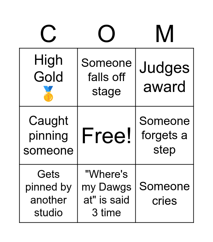 This bingo card has a free space and 12 words: Skirt falls off during Good Time, "moon bean ice cream" is said 3 times, Someone cries, Someone forgets a step, Someone falls off stage, Judges award, "Where's my Dawgs at" is said 3 time, Clap ππΎ, High Gold π₯, Caught pinning someone, Gets pinned by another studio and Someone does the touge shake ποΈπ ποΈ.