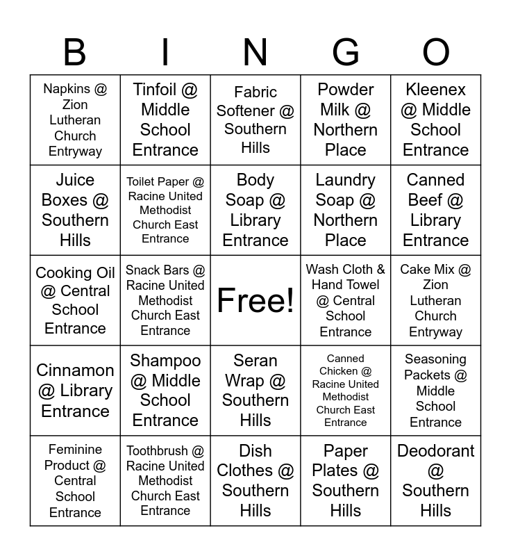This bingo card has a free space and 30 words: Toothbrush @ Library Entranc, Toothbrush @ Racine United Methodist Church East Entrance, Fabric Softener @ Southern Hills, Dish Soap @ Central School Entrance, Kleenex @ Middle School Entrance, Napkins @ Zion Lutheran Church Entryway, Toilet Paper @ Racine United Methodist Church East Entrance, Body Soap @ Library Entrance, Laundry Soap @ Northern Place, Deodorant @ Southern Hills, Feminine Product @ Central School Entrance, Shampoo @ Middle School Entrance, Paper Plates @ Southern Hills, Salt & Pepper @ Racine United Methodist Church East Entrance, Cinnamon @ Library Entrance, Honey @ Northern Place, Dish Clothes @ Southern Hills, Wash Cloth & Hand Towel @ Central School Entrance, Seasoning Packets @ Middle School Entrance, Juice Boxes @ Southern Hills, Snack Bars @ Racine United Methodist Church East Entrance, Flavored Potato Mix @ Library Entrance, Powder Milk @ Northern Place, Cake Mix @ Zion Lutheran Church Entryway, Cooking Oil @ Central School Entrance, Tinfoil @ Middle School Entrance, Seran Wrap @ Southern Hills, Canned Chicken @ Racine United Methodist Church East Entrance, Canned Beef @ Library Entrance and Band-Aid @ Northern Ridge (mailbox area).