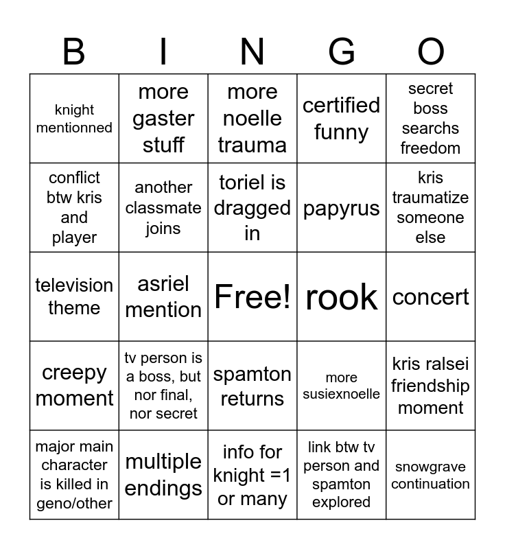 This bingo card has a free space and 24 words: tv person is a boss, but nor final, nor secret, multiple endings, toriel is dragged in, major main character is killed in geno/other, secret boss searchs freedom, knight mentionned, conflict btw kris and player, more gaster stuff, rook, spamton returns, papyrus, television theme, more susiexnoelle, kris ralsei friendship moment, another classmate joins, link btw tv person and spamton explored, concert, more noelle trauma, kris traumatize someone else, asriel mention, snowgrave continuation, creepy moment, certified funny and info for knight =1 or many.