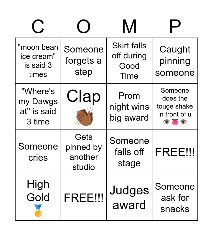 This bingo card has 16 words: FREE!!!, FREE!!!, Skirt falls off during Good Time, "moon bean ice cream" is said 3 times, Someone cries, Someone forgets a step, Someone falls off stage, Judges award, "Where's my Dawgs at" is said 3 time, Clap 👏🏾, High Gold 🥇, Caught pinning someone, Gets pinned by another studio, Someone does the touge shake in front of u 👁️👅👁️, Prom night wins big award and Someone ask for snacks.