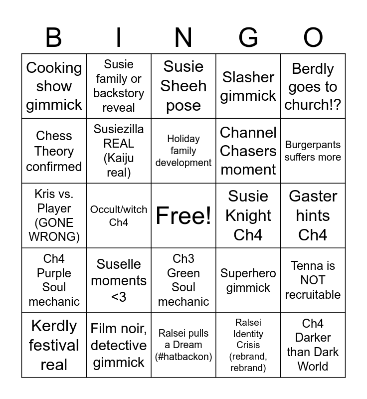 This bingo card has a free space and 29 words: Kerdly festival real, Mike = Friend, Occult/witch Ch4, Ch3 Secret Cowboy Boss, Cooking show gimmick, Susie Sheeh pose, Susiezilla REAL (Kaiju real), Suselle moments <3, Susie Knight Ch4, Film noir, detective gimmick, Gaster hints Ch4, Ch4 Darker than Dark World, Ralsei pulls a Dream (#hatbackon), Ralsei Identity Crisis (rebrand, rebrand), Burgerpants suffers more, Woman secret boss Ch4, Ch3 Green Soul mechanic, Ch4 Purple Soul mechanic, Berdly goes to church!?, Kris vs. Player (GONE WRONG), Superhero gimmick, Game show gimmick, Channel Chasers moment, Chess Theory confirmed, Slasher gimmick, Susie family or backstory reveal, Tenna is NOT recruitable, Holiday family development and Catti and Jockington in Dark World.
