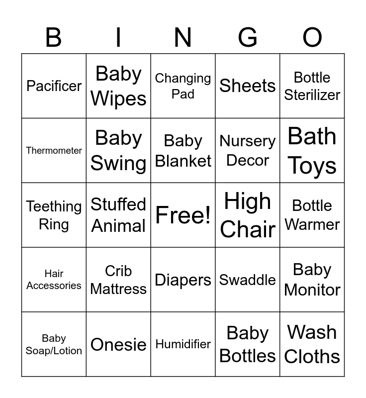 This bingo card has a free space and 26 words: Diapers, Baby Bottles, Baby Blanket, Onesie, Bottle Sterilizer, Pacificer, Thermometer, Baby Wipes, Bottle Warmer, Swaddle, Nursery Decor, Teething Ring, Baby Monitor, Baby Soap/Lotion, Stuffed Animal, Baby Book, Sheets, Hair Accessories, Changing Pad, Wash Cloths, Bath Toys, Humidifier, High Chair, Crib Mattress, Baby Swing and Baby Wrap.