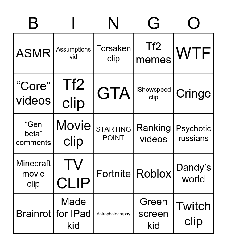 This bingo card has a free space and 24 words: TV CLIP, Made for IPad kid, GTA, Brainrot, WTF, ASMR, “Core” videos, Assumptions vid, Ranking videos, Fortnite, IShowspeed clip, “Gen beta” comments, Roblox, Dandy’s world, Tf2 clip, Green screen kid, Psychotic russians, Forsaken clip, Cringe, Movie clip, Twitch clip, Minecraft movie clip, Tf2 memes and Astrophotography.