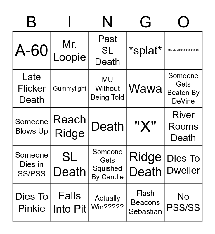 This bingo card has a free space and 24 words: SL Death, Falls Into Pit, MU Without Being Told, Dies To Pinkie, MINIGAMESSSSSSSSSSS, A-60, Late Flicker Death, Mr. Loopie, "X", Someone Gets Squished By Candle, Wawa, Someone Blows Up, Ridge Death, Dies To Dweller, Gummylight, Flash Beacons Sebastian, River Rooms Death, Past SL Death, Someone Gets Beaten By DeVine, Reach Ridge, No PSS/SS, Someone Dies in SS/PSS, *splat* and Actually Win?????.