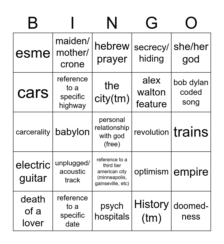 This bingo card has a free space and 24 words: unplugged/ acoustic track, reference to a specific date, the city(tm), death of a lover, she/her god, esme, cars, maiden/ mother/ crone, revolution, reference to a third tier american city (minneapolis, gainseville, etc), alex walton feature, carcerality, optimism, empire, reference to a specific highway, History (tm), trains, hebrew prayer, bob dylan coded song, babylon, doomed- ness, electric guitar, secrecy/ hiding and psych hospitals.