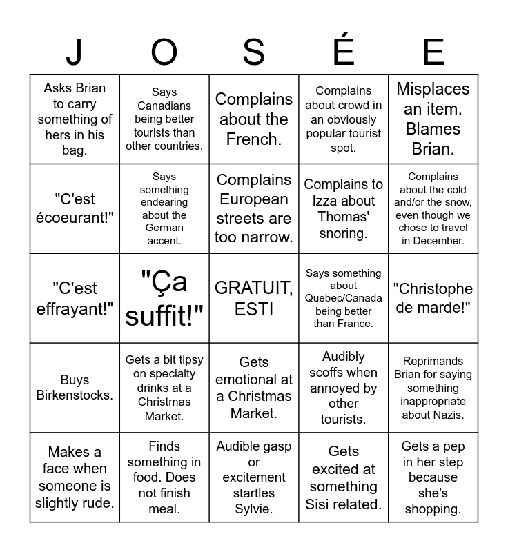 This bingo card has a free space and 29 words: Makes a face when someone is slightly rude., Complains stone streets in Europe hurt her feet., "Ça suffit!", Gets mad at Brian when he's navigating., Asks Brian to carry something of hers in his bag., Complains about the French., Says something endearing about the German accent., Gets a bit tipsy on specialty drinks at a Christmas Market., Says something about Quebec/Canada being better than France., Finds something in food. Does not finish meal., "Christophe de marde!", Gets a pep in her step because she's shopping., Audible gasp or excitement startles Sylvie., Gets excited at something Sisi related., Complains about the cold and/or the snow, even though we chose to travel in December., Compliments Izza on her navigating compared to Brian., Gets emotional at a Christmas Market., Buys Birkenstocks., Misplaces an item. Blames Brian., "C'est effrayant!", Audibly scoffs when annoyed by other tourists., *Audible Gasp* "Wow! Brian Regarde!", Complains to Izza about Thomas' snoring., "C'est écoeurant!", Complains about crowd in an obviously popular tourist spot., Says Canadians being better tourists than other countries., Reprimands Brian for saying something inappropriate about Nazis., Complains European streets are too narrow. and "Catherine and Tom are really missing out!".