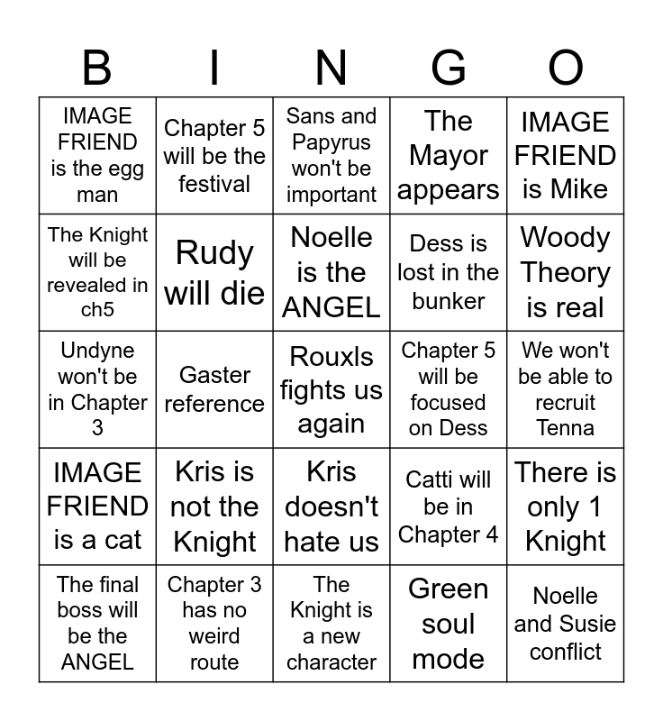 This bingo card has 25 words: Kris is not the Knight, The Knight is a new character, Noelle is the ANGEL, The final boss will be the ANGEL, IMAGE FRIEND is Mike, IMAGE FRIEND is the egg man, The Knight will be revealed in ch5, Chapter 5 will be the festival, Chapter 5 will be focused on Dess, Kris doesn't hate us, Dess is lost in the bunker, Undyne won't be in Chapter 3, Catti will be in Chapter 4, There is only 1 Knight, Rudy will die, Noelle and Susie conflict, We won't be able to recruit Tenna, Sans and Papyrus won't be important, Woody Theory is real, Gaster reference, Rouxls fights us again, Chapter 3 has no weird route, IMAGE FRIEND is a cat, The Mayor appears and Green soul mode.