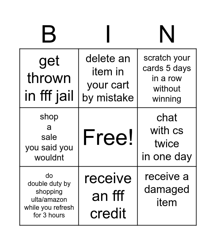 This bingo card has a free space and 8 words: chat with cs twice in one day, scratch your cards 5 days in a row without winning, delete an item in your cart by mistake, do double duty by shopping ulta/amazon while you refresh for 3 hours, get thrown in fff jail, receive a damaged item, shop a sale you said you wouldnt and receive an fff credit.