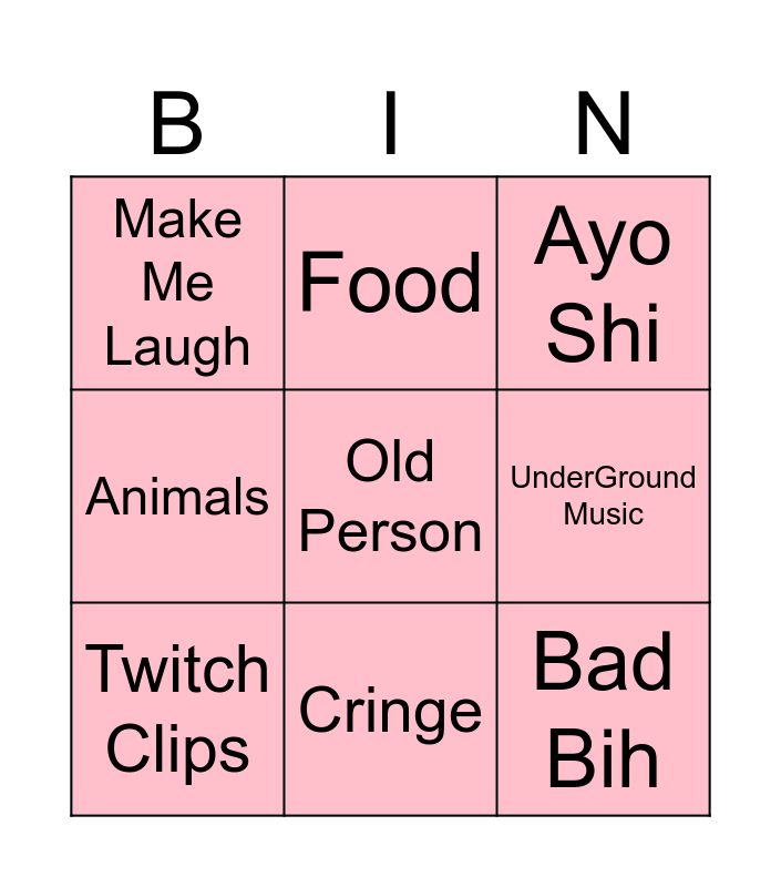 This bingo card has a free space and 8 words: UnderGround Music, Ayo Shi, Food, Twitch Clips, Make Me Laugh, Bad Bih, Animals and Cringe.