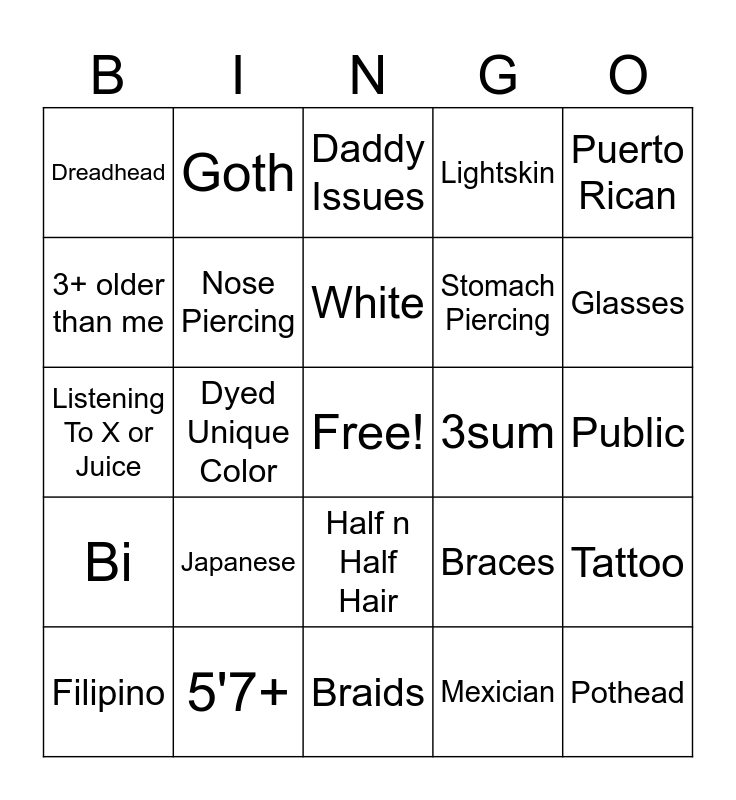 This bingo card has a free space and 24 words: Filipino, Japanese, White, Mexician, Puerto Rican, Dreadhead, Goth, Daddy Issues, 3sum, Public, Listening To X or Juice, Nose Piercing, Braces, Tattoo, 3+ older than me, 5'7+, Braids, Lightskin, Glasses, Bi, Dyed Unique Color, Half n Half Hair, Stomach Piercing and Pothead.