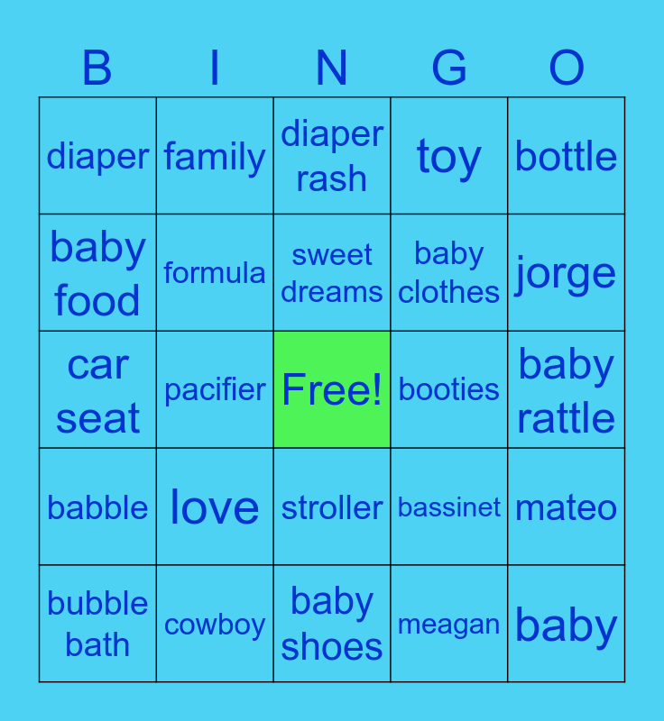 This bingo card has a free space and 24 words: love, cowboy, sweet dreams, bubble bath, bottle, diaper, baby food, family, booties, stroller, baby clothes, car seat, bassinet, mateo, formula, meagan, baby rattle, diaper rash, jorge, pacifier, baby, babble, toy and baby shoes.