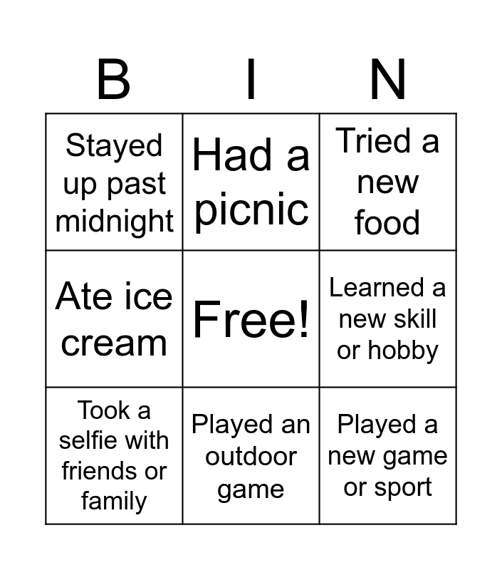 This bingo card has a free space and 20 words: Visited family during the break, Went to the beach, Tried a new food, Watched a movie in a theater, Read a book, Played a new game or sport, Celebrated a birthday, Stayed up past midnight, Traveled to a new place, Had a picnic, Helped with cooking or chores at home, Bought or received a new toy or gadget, Learned a new skill or hobby, Watched a sunrise or sunset, Took a selfie with friends or family, Helped someone else, Played an outdoor game, Ate ice cream, Drew or painted something and Learned something new about a family member.