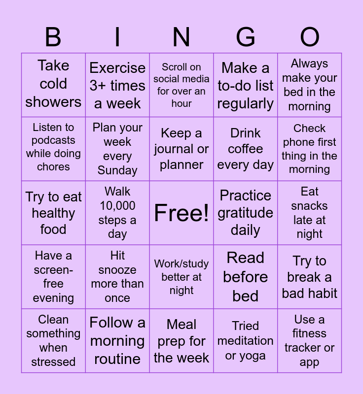 This bingo card has a free space and 24 words: Hit snooze more than once, Follow a morning routine, Keep a journal or planner, Clean something when stressed, Always make your bed in the morning, Take cold showers, Listen to podcasts while doing chores, Exercise 3+ times a week, Practice gratitude daily, Work/study better at night, Drink coffee every day, Try to eat healthy food, Read before bed, Try to break a bad habit, Plan your week every Sunday, Tried meditation or yoga, Eat snacks late at night, Scroll on social media for over an hour, Check phone first thing in the morning, Walk 10,000 steps a day, Use a fitness tracker or app, Have a screen-free evening, Make a to-do list regularly and Meal prep for the week.
