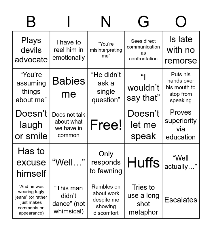 This bingo card has a free space and 24 words: “Well…”, “This man didn’t dance” (not whimsical), “He didn’t ask a single question”, “And he was wearing fugly jeans” (or rather just makes comments on appearance), Is late with no remorse, Plays devils advocate, “You’re assuming things about me”, I have to reel him in emotionally, Doesn’t let me speak, Only responds to fawning, “I wouldn’t say that”, Doesn’t laugh or smile, Huffs, “Well actually…”, Babies me, Tries to use a long shot metaphor, Proves superiority via education, “You’re misinterpreting me”, Puts his hands over his mouth to stop from speaking, Does not talk about what we have in common, Escalates, Has to excuse himself, Sees direct communication as confrontation and Rambles on about work despite me showing discomfort.