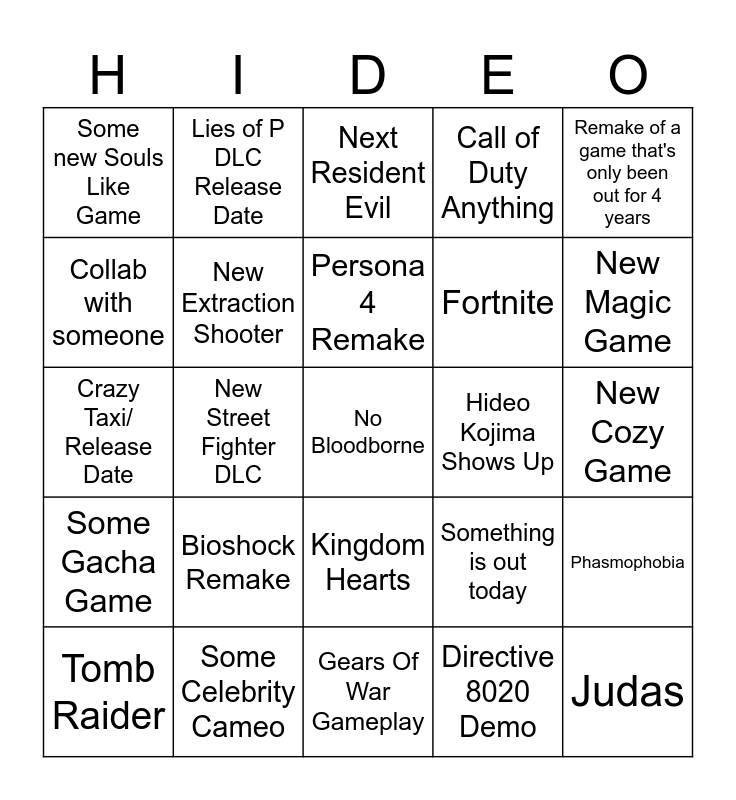 This bingo card has a free space and 24 words: Bioshock Remake, Some Celebrity Cameo, Persona 4 Remake, Tomb Raider, Remake of a game that's only been out for 4 years, Some new Souls Like Game, Collab with someone, Lies of P DLC Release Date, Hideo Kojima Shows Up, Kingdom Hearts, Fortnite, Crazy Taxi/ Release Date, Something is out today, Phasmophobia, New Extraction Shooter, Directive 8020 Demo, New Cozy Game, Next Resident Evil, New Magic Game, New Street Fighter DLC, Judas, Some Gacha Game, Call of Duty Anything and Gears Of War Gameplay.