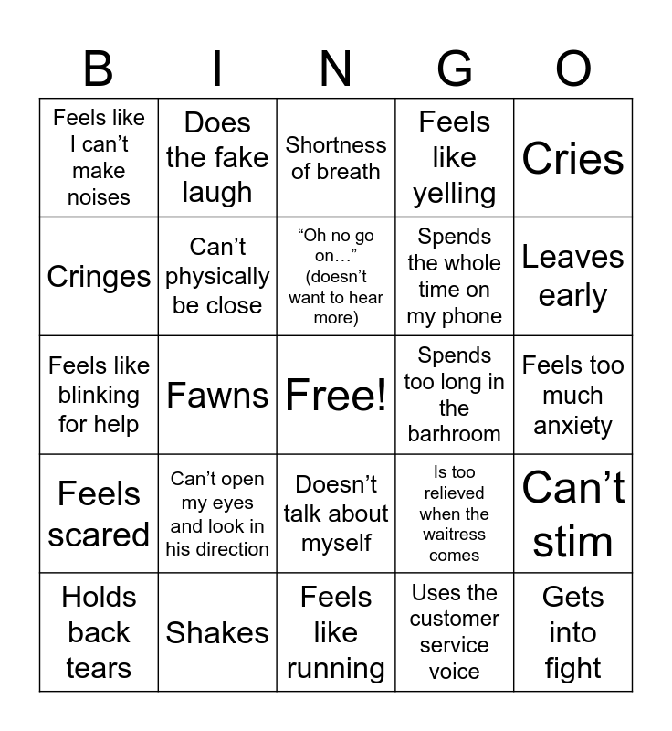 This bingo card has a free space and 24 words: Can’t open my eyes and look in his direction, Shakes, “Oh no go on…” (doesn’t want to hear more), Holds back tears, Cries, Feels like I can’t make noises, Cringes, Does the fake laugh, Spends too long in the barhroom, Doesn’t talk about myself, Spends the whole time on my phone, Feels like blinking for help, Is too relieved when the waitress comes, Can’t stim, Can’t physically be close, Uses the customer service voice, Feels too much anxiety, Shortness of breath, Leaves early, Fawns, Gets into fight, Feels scared, Feels like yelling and Feels like running.