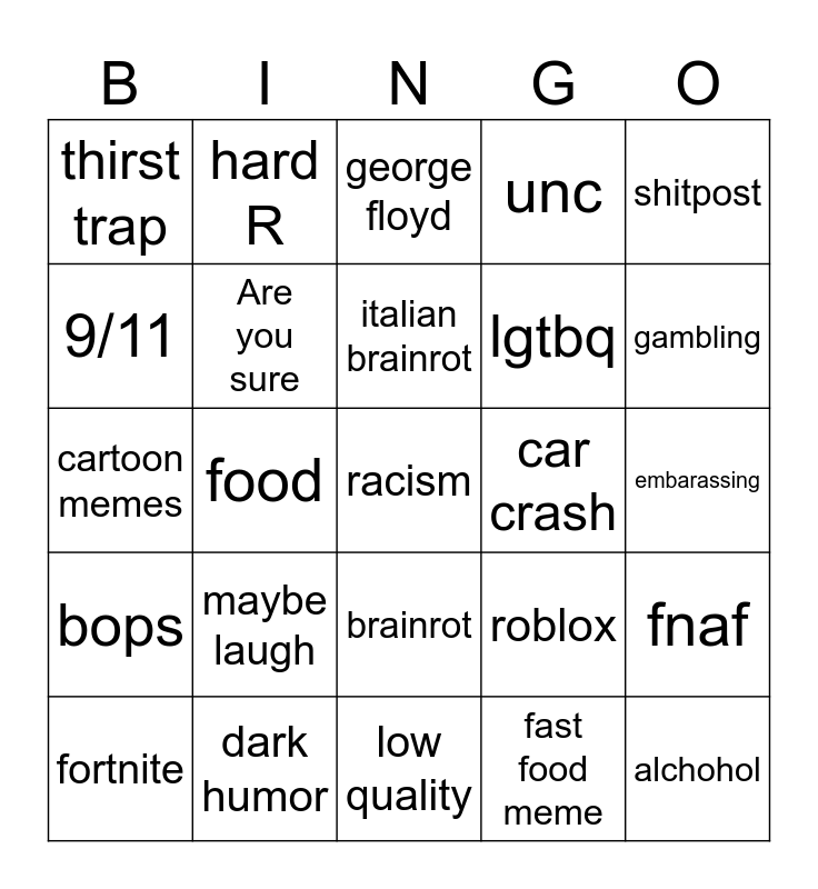 This bingo card has a free space and 24 words: maybe laugh, dark humor, italian brainrot, fortnite, shitpost, thirst trap, 9/11, hard R, car crash, brainrot, lgtbq, cartoon memes, roblox, fnaf, Are you sure, fast food meme, embarassing, george floyd, gambling, food, alchohol, bops, unc and low quality.