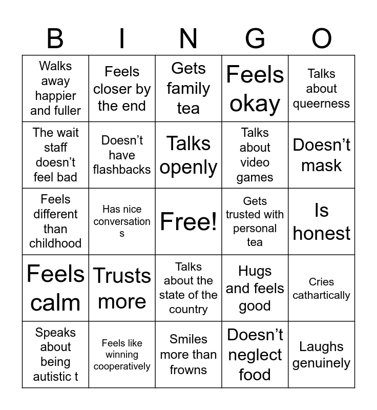 This bingo card has a free space and 24 words: Trusts more, Feels like winning cooperatively, Talks openly, Speaks about being autistic t, Talks about queerness, Walks away happier and fuller, The wait staff doesn’t feel bad, Feels closer by the end, Gets trusted with personal tea, Talks about the state of the country, Talks about video games, Feels different than childhood, Hugs and feels good, Cries cathartically, Doesn’t have flashbacks, Doesn’t neglect food, Is honest, Gets family tea, Doesn’t mask, Has nice conversation s, Laughs genuinely, Feels calm, Feels okay and Smiles more than frowns.