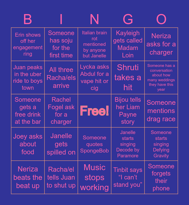 This bingo card has a free space and 50 words: Erin smokes for the first time, Someone forgets their phone, Abdul breaks something in public, Music stops working, Janelle gets spilled on, Joey vomits after the uber ride, Someone has soju for the first time, Group doesn’t make it to boys town, Juan peaks in the uber ride to boys town, Lycka ends up on the ground, All three Racha/els arrive, Kayleigh gets called Madam Loin, Someone starts singing Defying Gravity, Janelle starts singing Decode by Paramore, Someone mentions Brat Summer, Abdul asks Lycka for a vape hit or cig, Lycka asks Abdul for a vape hit or cig, Bijou tells her Liam Payne story, Someone’s on their period, Neriza asks for a charger, Rachel Fogel ask for a charger, Tinbit says “I can’t stand you”, Erin shows off her engagement ring, Shruti takes a hit, Someone gifts Juan a trinket, Someone other than Abdul kisses Juan, Someone has a conversation about how many weddings they have this year, ChatGPT mentioned, Italian brain rot mentioned by anyone but Janelle, Someone quotes SpongeBob, Ashani mentions her cat Socks, Someone mentions that we should go to karaoke, Kayleigh tells Juan to shut up, Bijou tells Juan to shut up, Racha/el tells Juan to shut up, Juan and Abdul get into a pinch fight, Kayleigh and Lycka do domestic violence, Juan and Abdul do domestic violence, Joey carries Janelle outside the bar, Someone mentions drag race, Juan dances to Gnarly, Juan tries to paint his nails before leaving the house, Juan yells “Look at what you did to me” then holds up his crooked pinky, Juan yells “Look at what you did to me” then shows his burn mark, Neriza beats the beat up, Someone gets a free drink at the bar, Someone asks for Lactaid, Abdul twerks in public, Joey asks about food and Abdul asks about food.