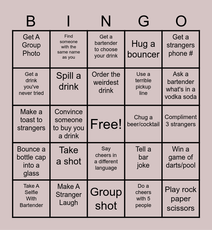 This bingo card has a free space and 24 words: Take a shot, Make A Stranger Laugh, Order the weirdest drink, Take A Selfie With Bartender, Get a strangers phone #, Get A Group Photo, Get a drink you've never tried, Find someone with the same name as you, Chug a beer/cocktail, Say cheers in a different language, Use a terrible pickup line, Make a toast to strangers, Tell a bar joke, Win a game of darts/pool, Spill a drink, Do a cheers with 5 people, Compliment 3 strangers, Get a bartender to choose your drink, Ask a bartender what's in a vodka soda, Convince someone to buy you a drink, Play rock paper scissors, Bounce a bottle cap into a glass, Hug a bouncer and Group shot.