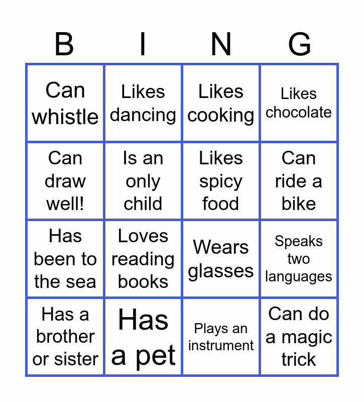 This bingo card has 16 words: Has a pet, Speaks two languages, Likes cooking, Can whistle, Has been to the sea, Likes dancing, Wears glasses, Plays an instrument, Can draw well!, Is an only child, Has a brother or sister, Likes chocolate, Loves reading books, Can ride a bike, Likes spicy food and Can do a magic trick.