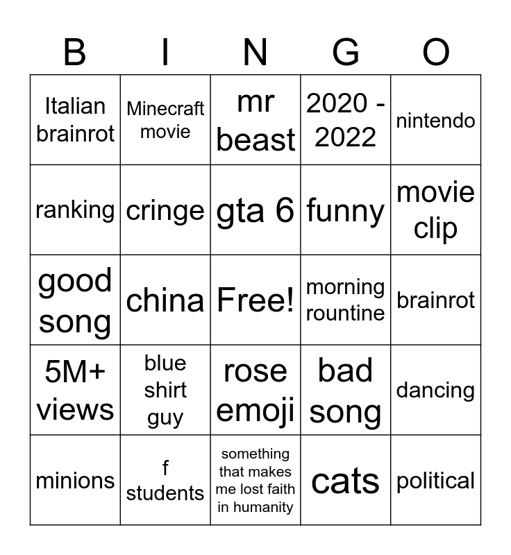 This bingo card has a free space and 24 words: blue shirt guy, f students, gta 6, minions, nintendo, Italian brainrot, ranking, Minecraft movie, morning rountine, rose emoji, funny, good song, bad song, dancing, cringe, cats, brainrot, mr beast, movie clip, china, political, 5M+ views, 2020 - 2022 and something that makes me lost faith in humanity.