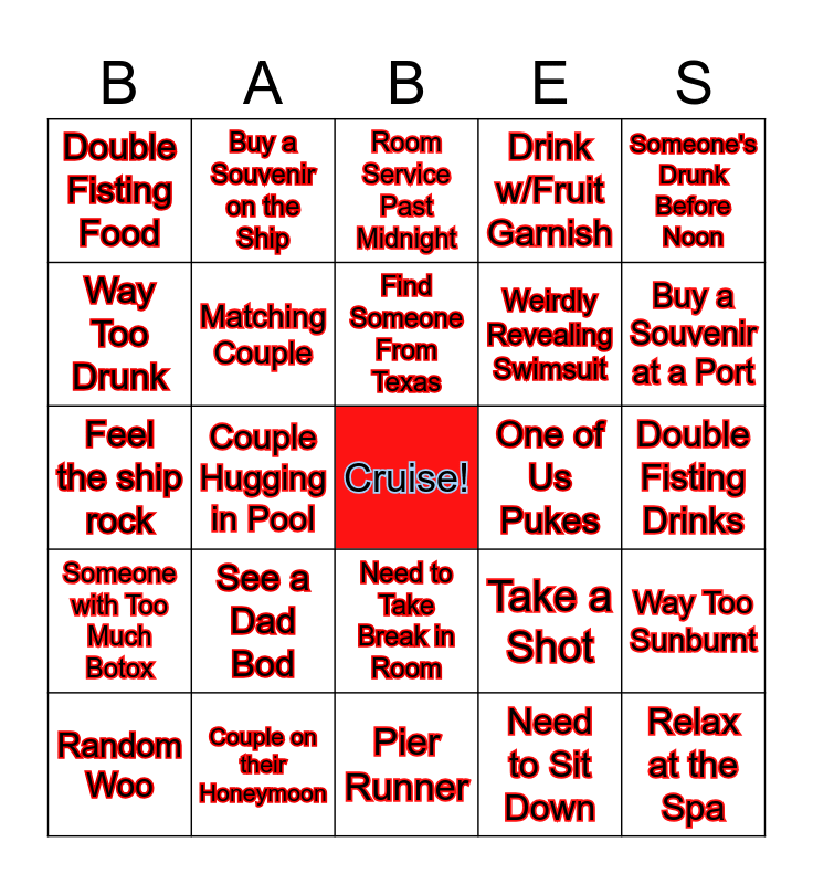 This bingo card has a free space and 24 words: See a Dad Bod, Couple on their Honeymoon, Find Someone From Texas, Random Woo, Someone's Drunk Before Noon, Double Fisting Food, Way Too Drunk, Buy a Souvenir on the Ship, One of Us Pukes, Need to Take Break in Room, Weirdly Revealing Swimsuit, Feel the ship rock, Take a Shot, Way Too Sunburnt, Matching Couple, Need to Sit Down, Double Fisting Drinks, Room Service Past Midnight, Buy a Souvenir at a Port, Couple Hugging in Pool, Relax at the Spa, Someone with Too Much Botox, Drink w/Fruit Garnish and Pier Runner.