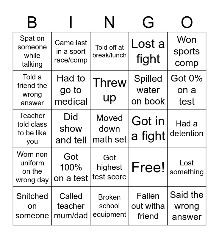 This bingo card has 25 words: Got 100% on a test, Broken school equipment, Threw up, Snitched on someone, Won sports comp, Spat on someone while talking, Told a friend the wrong answer, Came last in a sport race/comp, Got in a fight, Got highest test score, Spilled water on book, Teacher told class to be like you, Free!, Lost something, Had to go to medical, Said the wrong answer, Had a detention, Told off at break/lunch, Got 0% on a test, Did show and tell, Moved down math set, Called teacher mum/dad, Worn non uniform on the wrong day, Lost a fight and Fallen out witha friend.