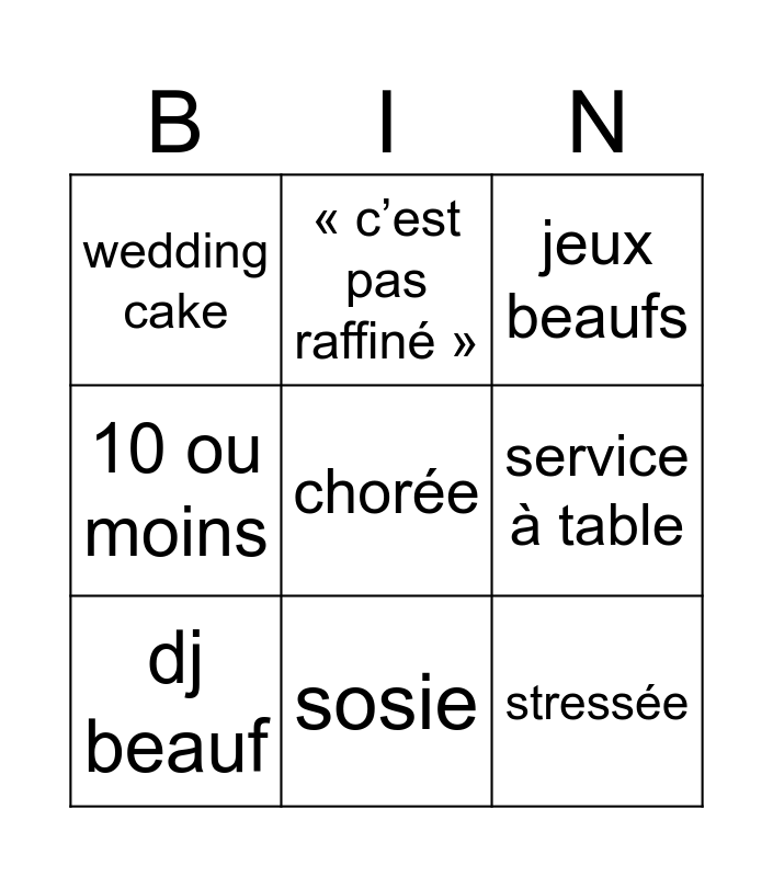 This bingo card has a free space and 8 words: service à table, jeux beaufs, « c’est pas raffiné », dj beauf, wedding cake, stressée, 10 ou moins and sosie.
