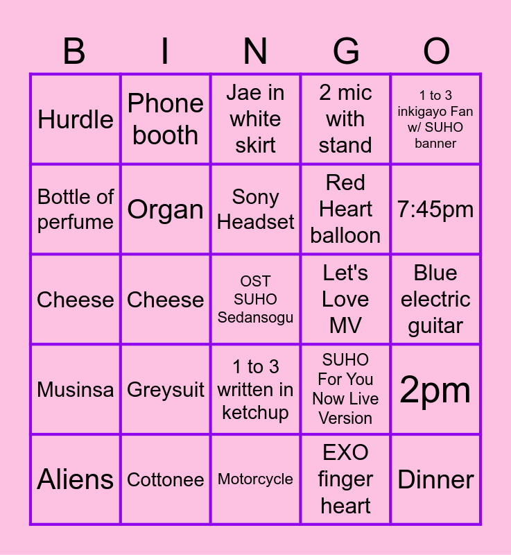 This bingo card has 50 words: Falling shattered glass, OST SUHO Sedansogu, Bread and Pastries, Motorcycle, Greysuit, Black nail polish, Phone booth, Bridge, Bottle of perfume, Do You Have a Moment, Organ, 2 mic with stand, 2pm, SUHO For You Now Live Version, 2 amplifiers, Love You More Gradually| Missing Crown Prince OST, Sony Headset, Let's Love MV, Suho hand heart 🫶, 1 to 3 inkigayo Fan w/ SUHO banner, Cheese, EXO finger heart, Hurdle, Red Heart balloon, Little electric guitar, Dinner, 7:45pm, It's live, Jae in white skirt, 1 to 3 written in ketchup, Kwangya cafe, SUHO as an angel, 1 to 3 medley, Zero gravity, Cottonee, Street light / lamp post, Suho with lollipop, Sunset, N Seoul Tower, Blue electric guitar, Suhome pajamas, Olympic Hall venue, 1 to 3, The eclipse of you, Aliens, Cheese, Burger, Monalisa, Musinsa and I.D..