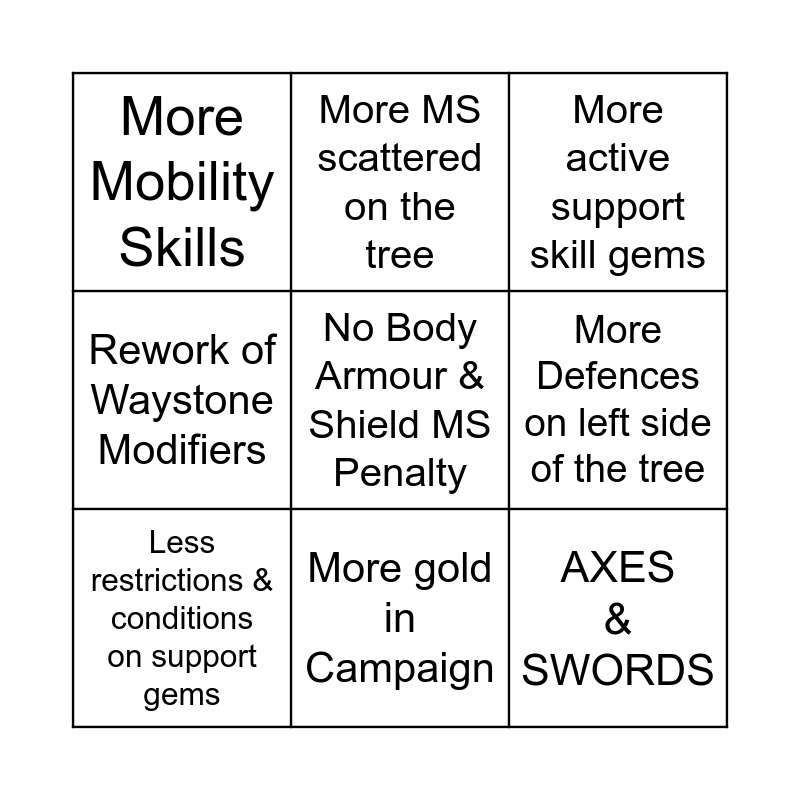 This bingo card has a free space and 8 words: More Defences on left side of the tree, More active support skill gems, More MS scattered on the tree, Less restrictions & conditions on support gems, More Mobility Skills, AXES & SWORDS, Rework of Waystone Modifiers and More gold in Campaign.